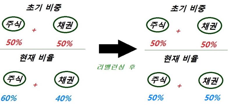초기 비율은 주식 50%, 채권 50% / 현재 비율은 주식 60%, 채권 40%이라면 리밸런싱은 초기 목표 비율을 유지함으로써 주식의 일부를 매도하고 채권을 매수하여 다시 주식 50%, 채권 50%로 비율을 맞춘다.