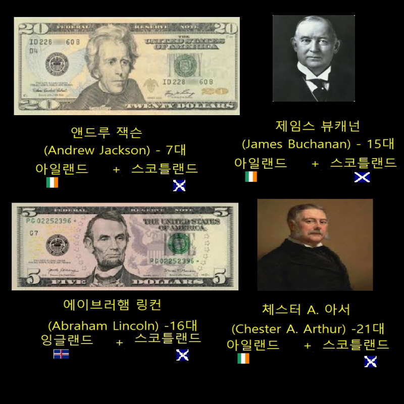 - 앤드루 잭슨 (7대), 제임스 뷰캐넌 (15대): 아일랜드 + 스코틀랜드
