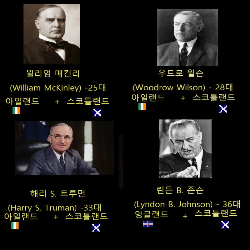- 해리 트루먼, 우드로 윌슨, 윌리엄 맥킨리: 잉글랜드 + 아일랜드
