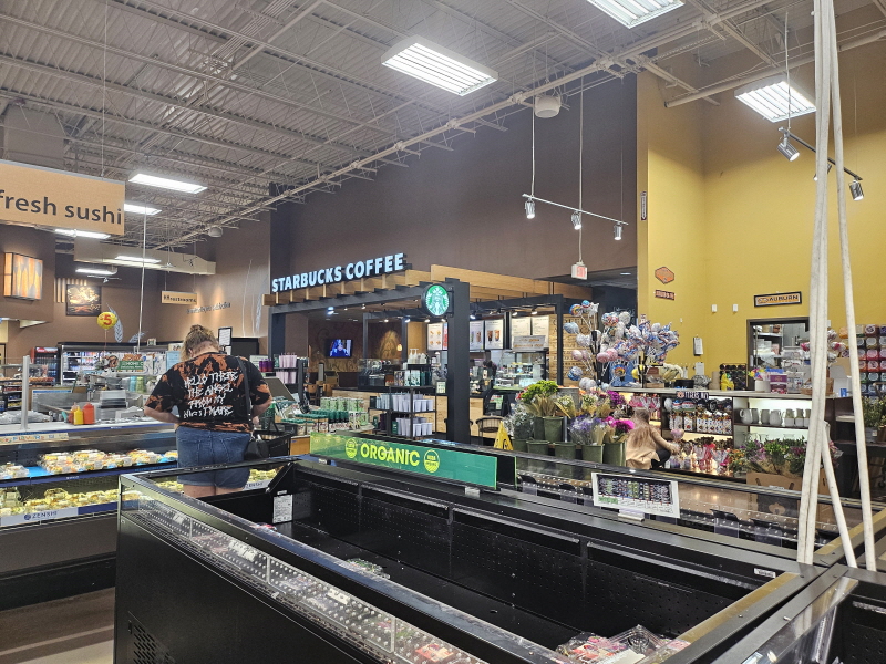 저 너머, 스타벅스 커피점도 들어와 있고 바로앞에 유기농 과일코너와 스시 코너도 보이네요