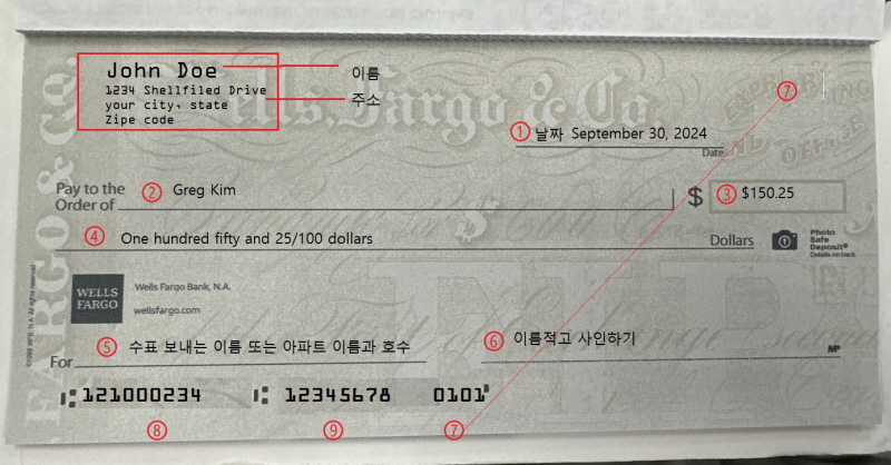 즉, 수표 왼쪽 하단의 For/또는 Memo(메모란)에는 이 수표의 용도를 적습니다. 예: Rent for September, Invoice 12345 등.