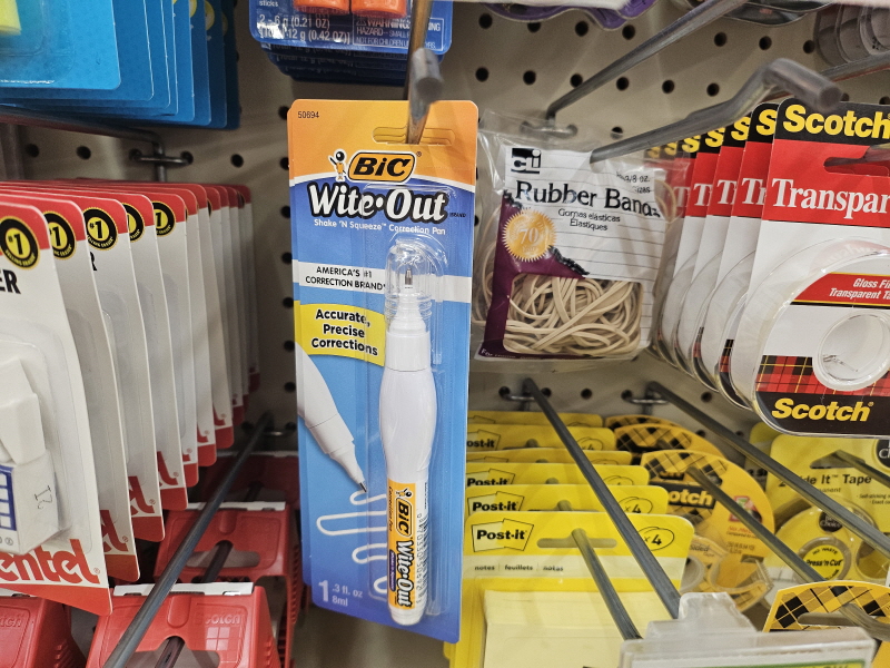 수정 테이프- 'Correction tape', 액체로 된 수정액은 'Correction Fluid'라 합니다. 미국의 BIC회사에서 생산되는 제품이 워낙 유명해서 두개를 합쳐 ↘'White-out'이라고 부르기도 합니다.