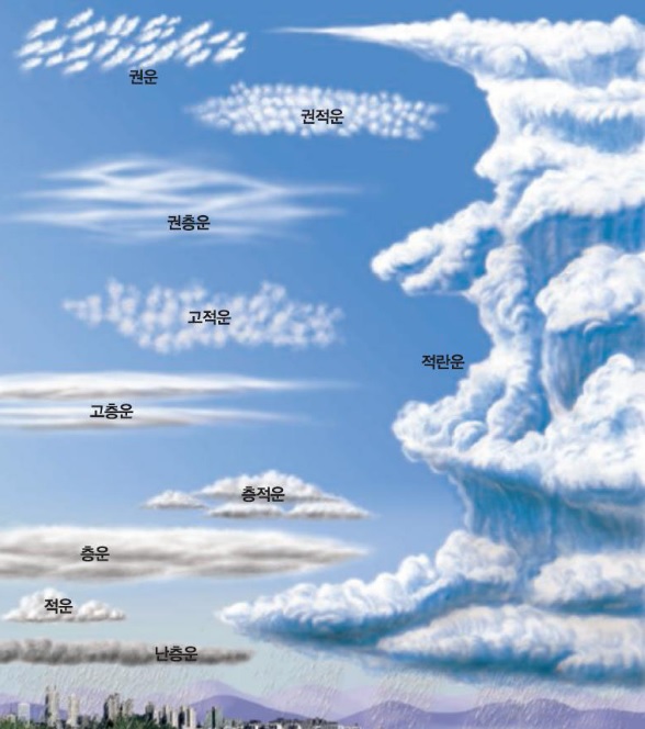 왜냐하면 우리나라는 해양성 기후, 4계절의 영향으로 변화는 대기압, 높은 고도에서 낮은 기온으로 응결되는 조건 등을 가진다. 그래서 상층에 있는 구름부터 하층의 구름까지 다~~~볼수 있다.