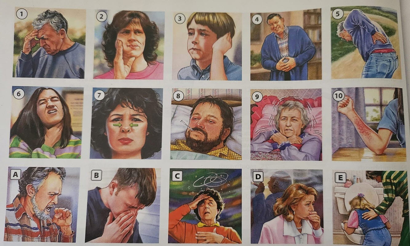 - A. 기침을 하다: cough[kaaf], B. 재채기하다: sneeze[sneez] , C. 어지러움을 느끼다 : feel dizzy[feel di·zee], D. 메스꺼움을 느끼다 : feel nauseous [feel naa·shuhs] , E. 구토를 하다 : throw up/vomit [throw up/ vaa·muht ] ⑪ 벌레에 물린 상처 : insect bite , ⑫ 멍 : bruise[brooz ], ⑬ 벤 상처: cu[kuht], ⑭ 햇빛에 탄 상처: sunburn [suhn·burn ], ⑮ 물집: blister [bli·str], ⑯ 부어오르른 손가락 : swollen finger[swow·luhn fing·gr], ⑰ 코피가 나다: bloody nose , ⑱ 발목을 삐다 : sprained ankle[spraynd ang·kl]