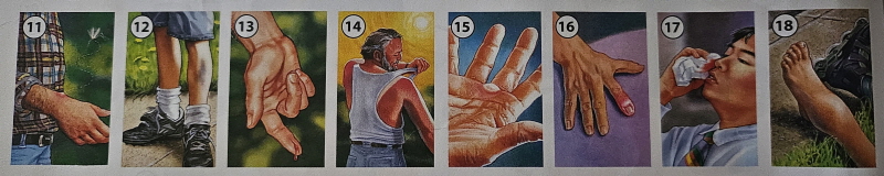 - A. 기침을 하다: cough[kaaf], B. 재채기하다: sneeze[sneez] , C. 어지러움을 느끼다 : feel dizzy[feel di·zee], D. 메스꺼움을 느끼다 : feel nauseous [feel naa·shuhs] , E. 구토를 하다 : throw up/vomit [throw up/ vaa·muht ] ⑪ 벌레에 물린 상처 : insect bite , ⑫ 멍 : bruise[brooz ], ⑬ 벤 상처: cu[kuht], ⑭ 햇빛에 탄 상처: sunburn [suhn·burn ], ⑮ 물집: blister [bli·str], ⑯ 부어오르른 손가락 : swollen finger[swow·luhn fing·gr], ⑰ 코피가 나다: bloody nose , ⑱ 발목을 삐다 : sprained ankle[spraynd ang·kl]