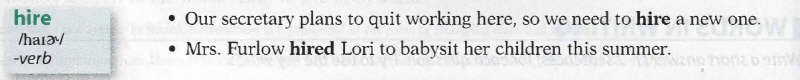 ① Hire은 기본적으로 활용은 동사로 ' to pay someone to work for you'입니다. 특히 미국 영어에서는 'to hire'가 사람을 고용한다는 뜻으로 쓰입니다.